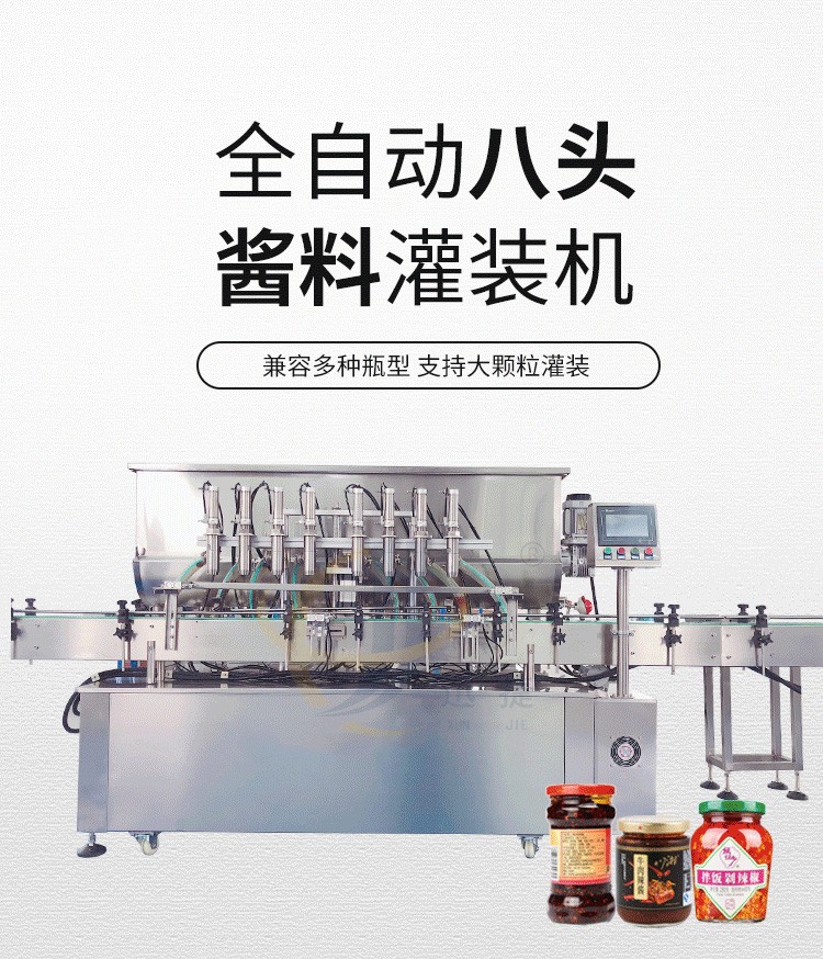全自動八頭醬料灌裝機(jī)采用活塞式灌裝原理,適用于調(diào)味品中帶顆粒并且濃度較大的辣椒醬、豆瓣醬、花生醬、香菇醬、果醬