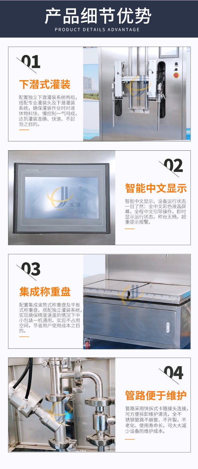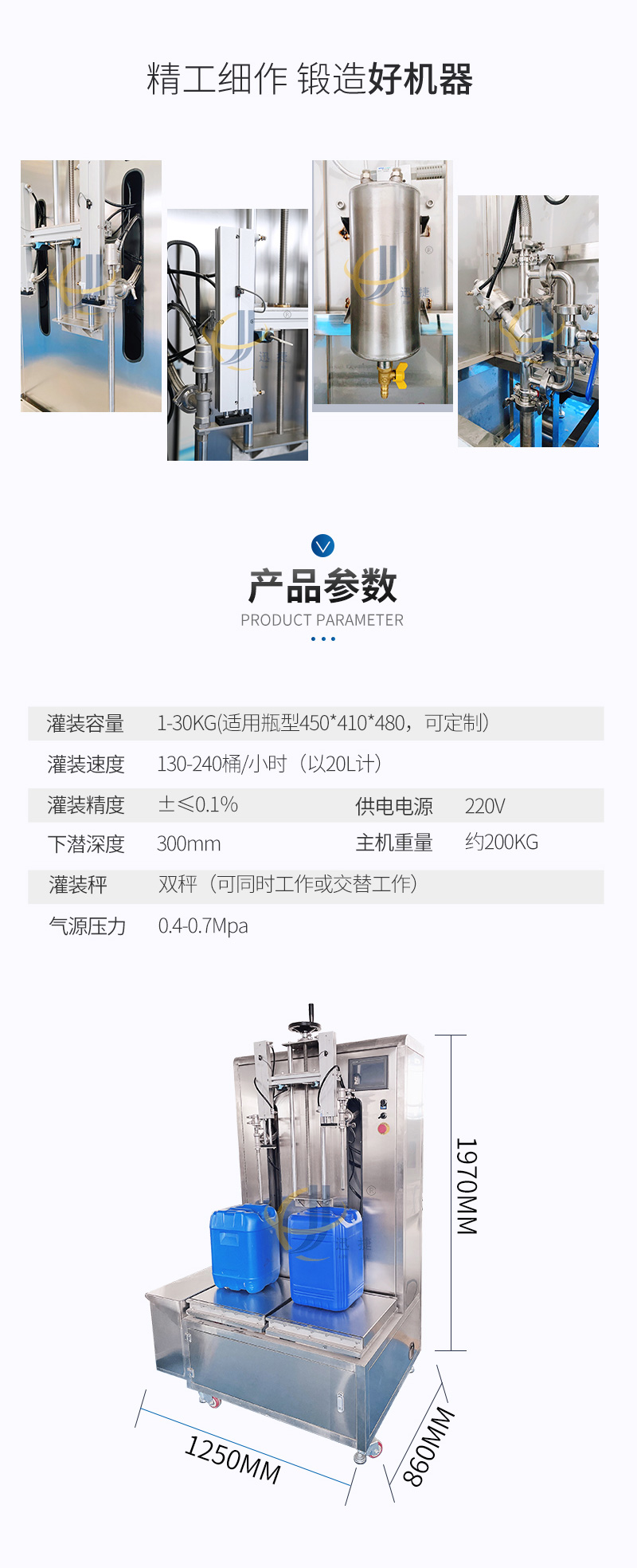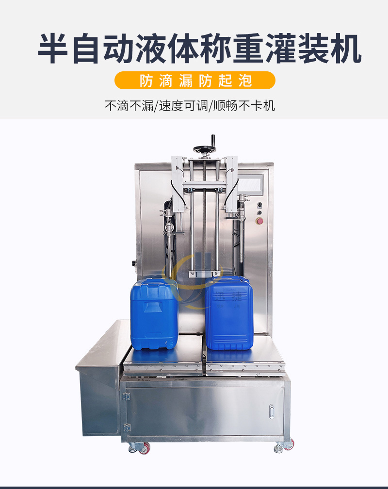 半自動液體稱重灌裝機適用于各種水劑以及高泡類液體的灌裝。如:飲料、醋、醬油、液體化妝品、蛋白液、玻璃水等。