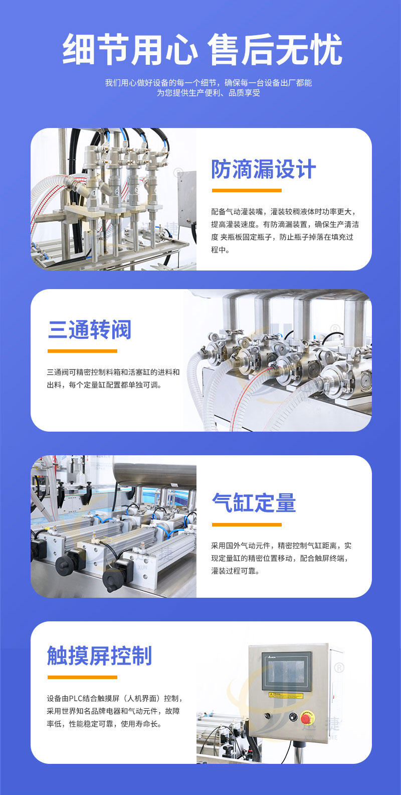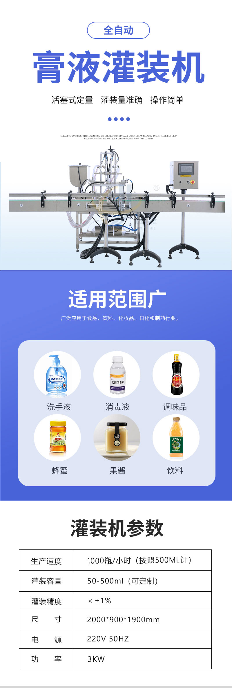 全自動膏液灌裝機(jī)適用于食品、飲料、化妝品、日化和制藥行業(yè)。灌裝頭設(shè)有特殊防漏裝置,灌裝無拉絲,滴漏現(xiàn)象。