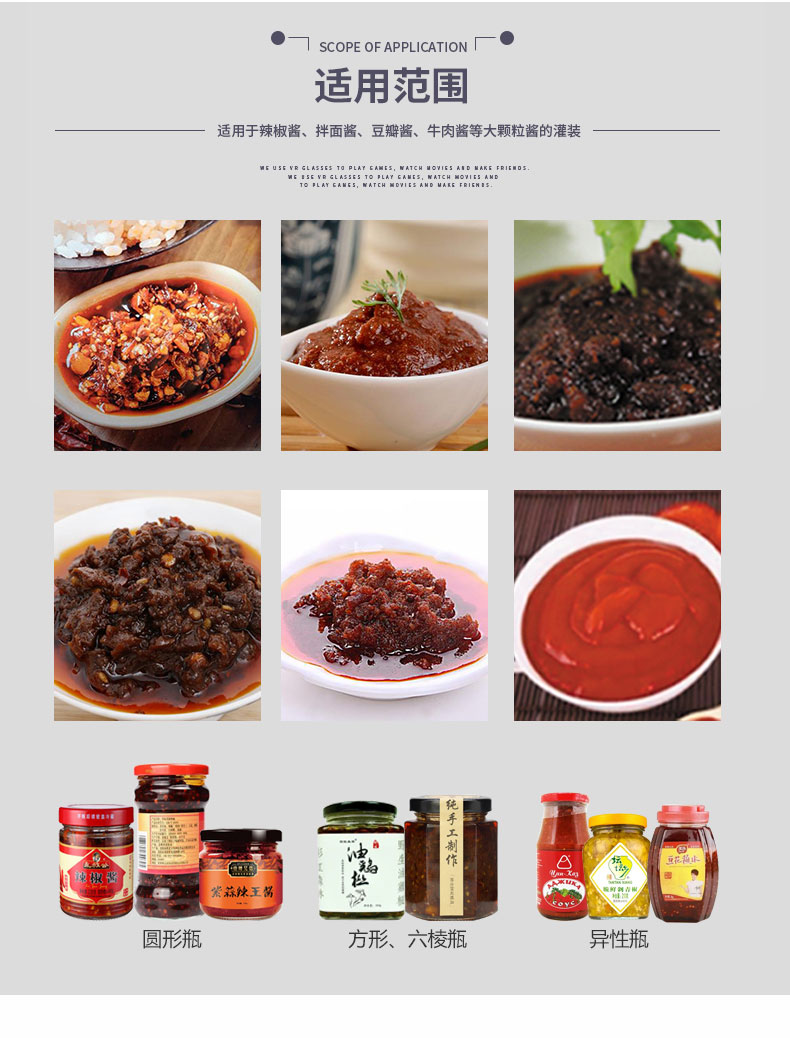 雙頭高速醬料灌裝機適用于調(diào)味品中帶顆粒并且濃度較大的辣椒醬、豆瓣醬、花生醬、香菇醬、果醬、牛油火鍋底料。