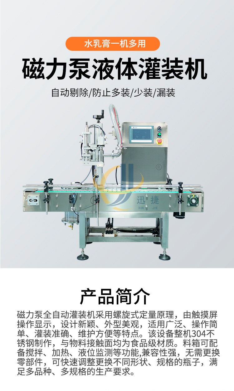 磁力泵全自動灌裝機(jī)采用螺旋式定量原理,由觸摸屏操作顯示,設(shè)計(jì)新穎、外型美觀,適用廣泛、操作簡