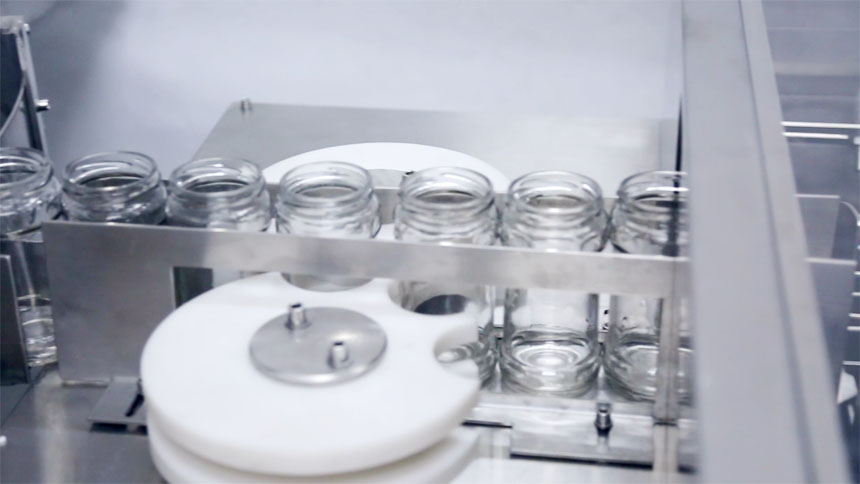 設(shè)備介紹:醬類灌裝線配套廣口玻璃瓶洗瓶機(jī)具有性能可靠、操作簡單、清洗效果良好、工作效率高等特點(diǎn),主要由不銹鋼水泵、高壓噴頭、電器箱等組成。它的工作原理是先將需要清洗的瓶子裝進(jìn)瓶盤內(nèi),然后人工送入工位,通過循環(huán)水噴將需要清洗的瓶子注滿水沉至清洗槽先進(jìn)行簡單的粗洗。然后瓶子會(huì)上升推進(jìn)洗瓶機(jī)的第二工位,在第二工位會(huì)進(jìn)行三次仔細(xì)的清洗,在經(jīng)過三次氣沖、甩干,再自動(dòng)進(jìn)入到滅菌烘箱。清洗過程為粗洗一次,仔細(xì)清洗三次,然后是烘干。