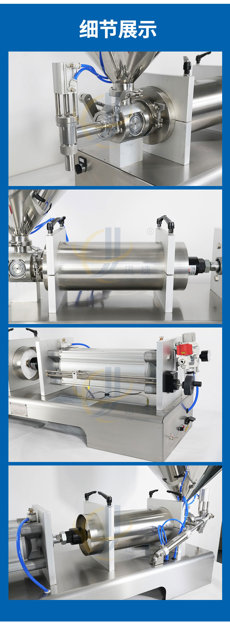 該機(jī)為半自動(dòng)膏體灌裝機(jī),是日化行業(yè)、醫(yī)藥行業(yè)、食品行業(yè)、油墨行業(yè)和涂料行業(yè)的理想灌裝充填設(shè)備,灌裝悶頭采用防滴漏。