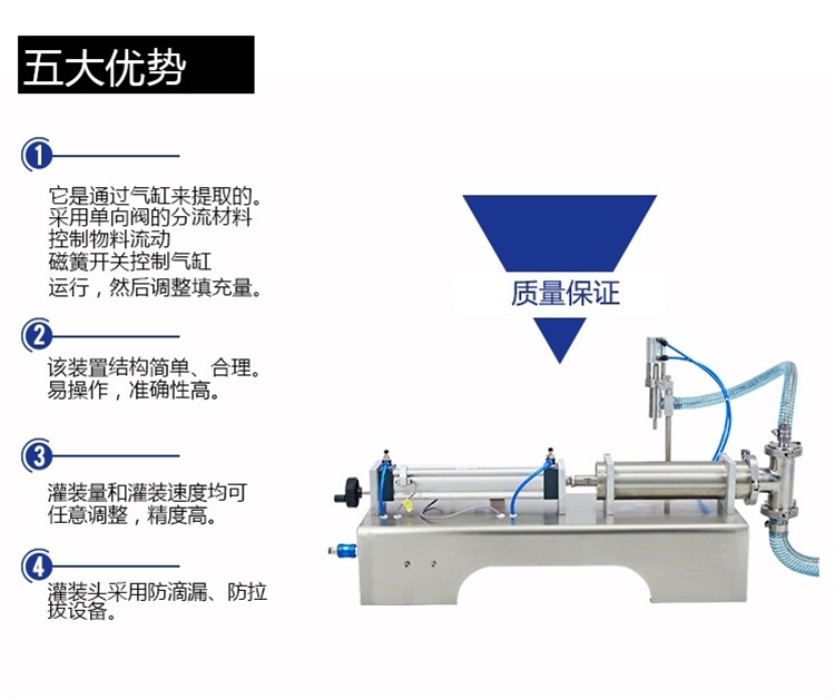 A、該設(shè)備通過(guò)氣缸帶動(dòng)一個(gè)活塞來(lái)抽取和打出物料,用單向閥控制物料流向,并以磁簧開關(guān)控制氣缸的行程,即可調(diào)節(jié)灌裝量。